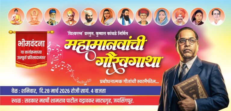 शिरोळ / प्रतिनिधी जयसिंगपूर येथे येत्या शनिवारी (दि. २८ मार्च) एक प्रेरणादायी सांस्कृतिक मेजवानी रंगणार असून ‘महामानवांची गौरवगाथा’ या संगीतमय …