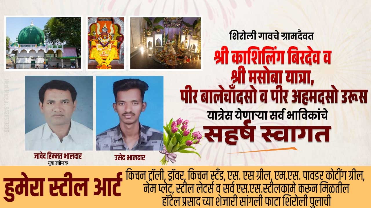 शिरोली गावचे ग्रामदैवत श्री काशिलिंग बिरदेव व श्री मसोबा यात्रा, पीर बालेचाँदसो व पीर अहमदसो उरूस यात्रेस येणाऱ्या सर्व भाविकांचे सहर्ष स्वागत April 26, 2026 by aamachimarathi Spread the love https://aamachimarathi.com/wp-content/uploads/2026/04/VID-20260426-WA0039-1.mp4 शिरोली गावचे ग्रामदैवत श्री काशिलिंग बिरदेव व श्री मसोबा यात्रा, पीर बालेचाँदसो व पीर अहमदसो उरूस यात्रेस येणाऱ्या सर्व भाविकांचे सहर्ष स्वागत शुभेच्छुक हुमेरा स्टील आर्ट पुलाची शिरोली
